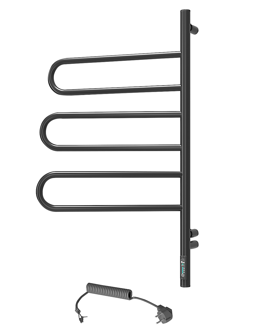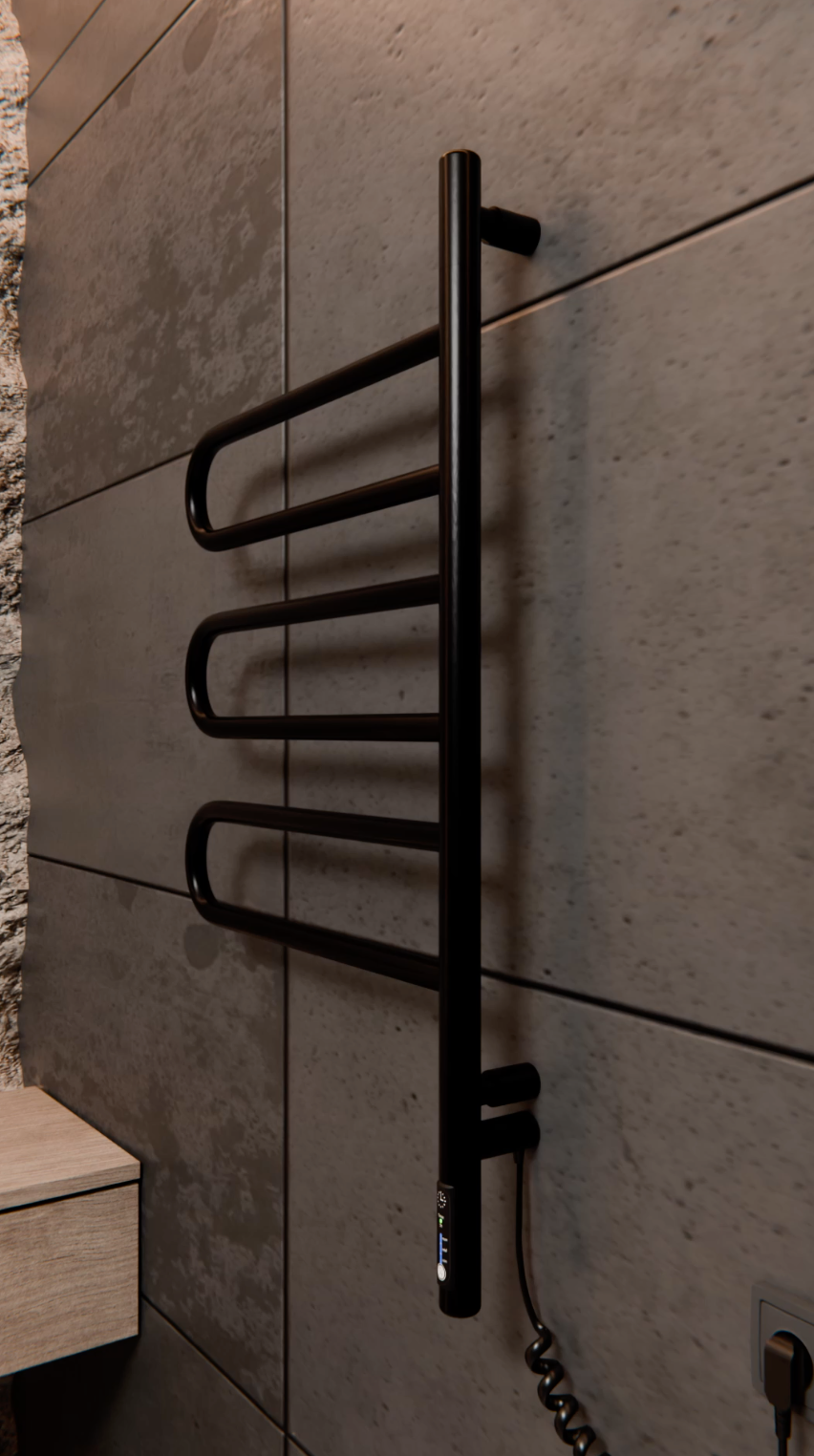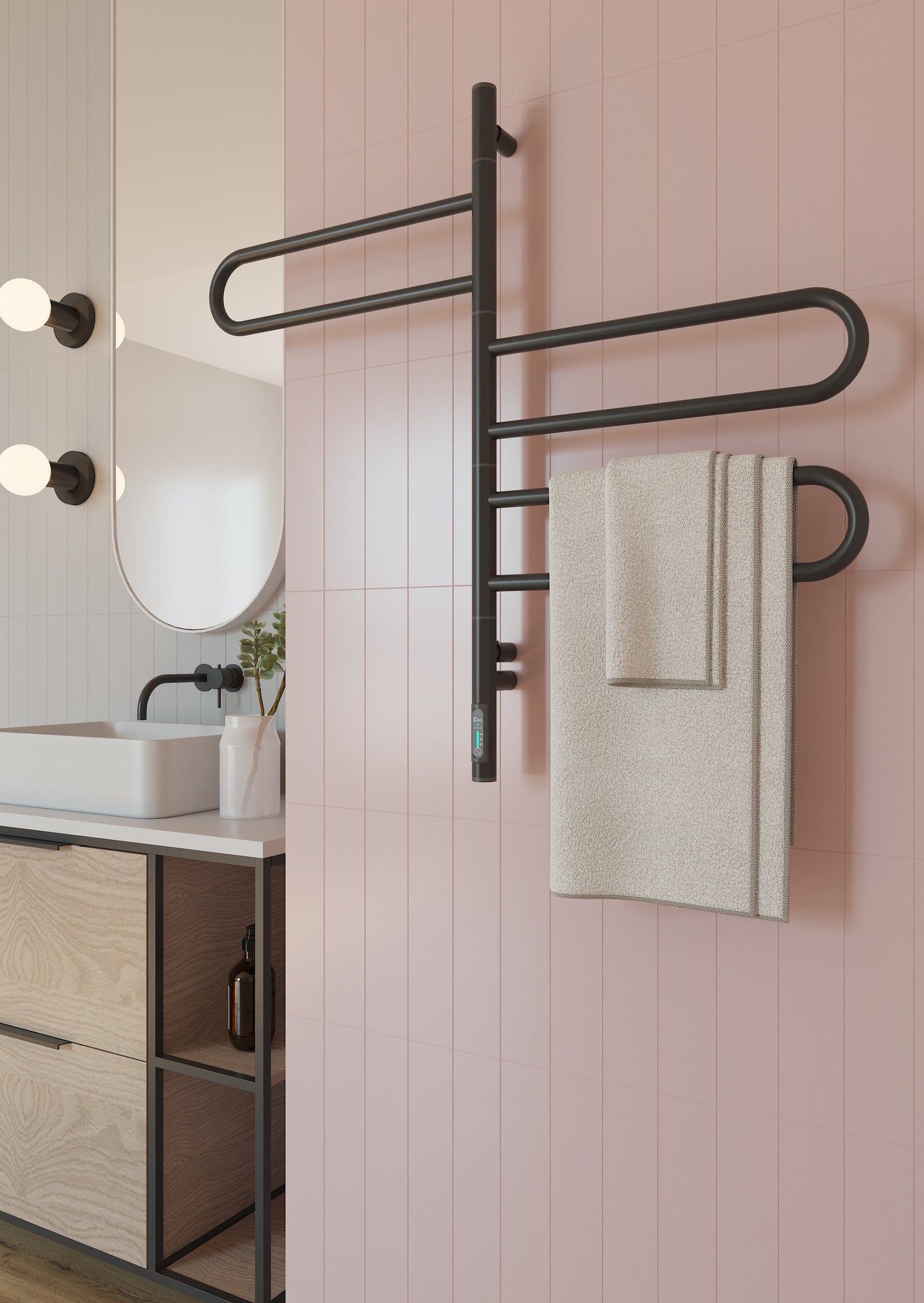 Este radiador toallero eléctrico para baño con acabado en negro mate cuenta con tres barras giratorias, cada una de las cuales puede girar 180° independientemente de las otras. Decisión de diseño perfecta para clientes que están totalmente enamorados de los colores industriales y las formas concisas del metal.