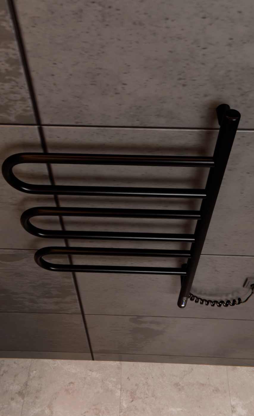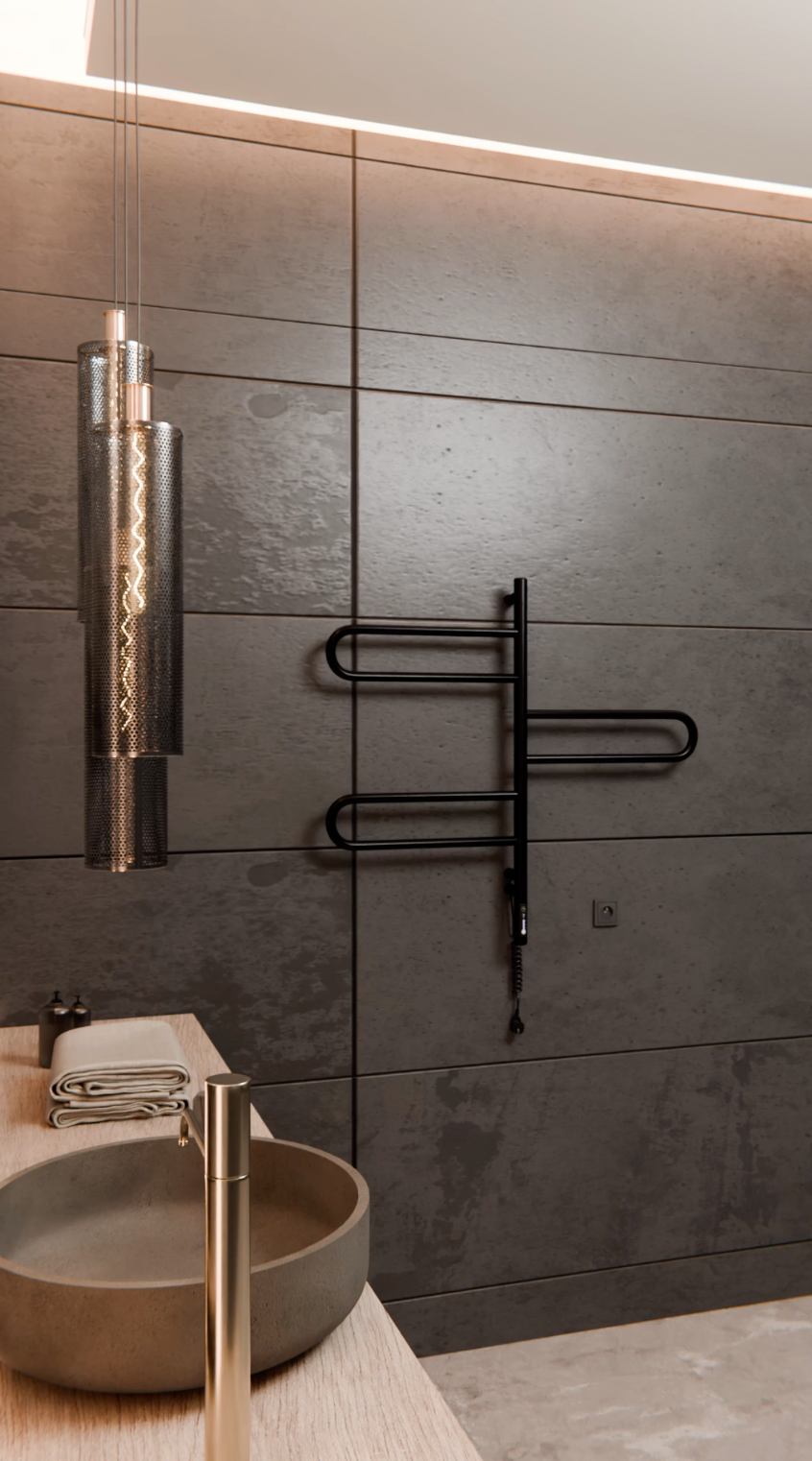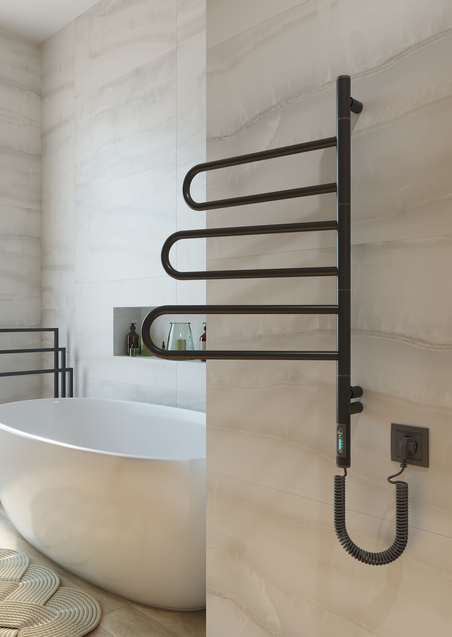 Este radiador toallero eléctrico para baño con acabado en negro mate cuenta con tres barras giratorias, cada una de las cuales puede girar 180° independientemente de las otras. Decisión de diseño perfecta para clientes que están totalmente enamorados de los colores industriales y las formas concisas del metal.