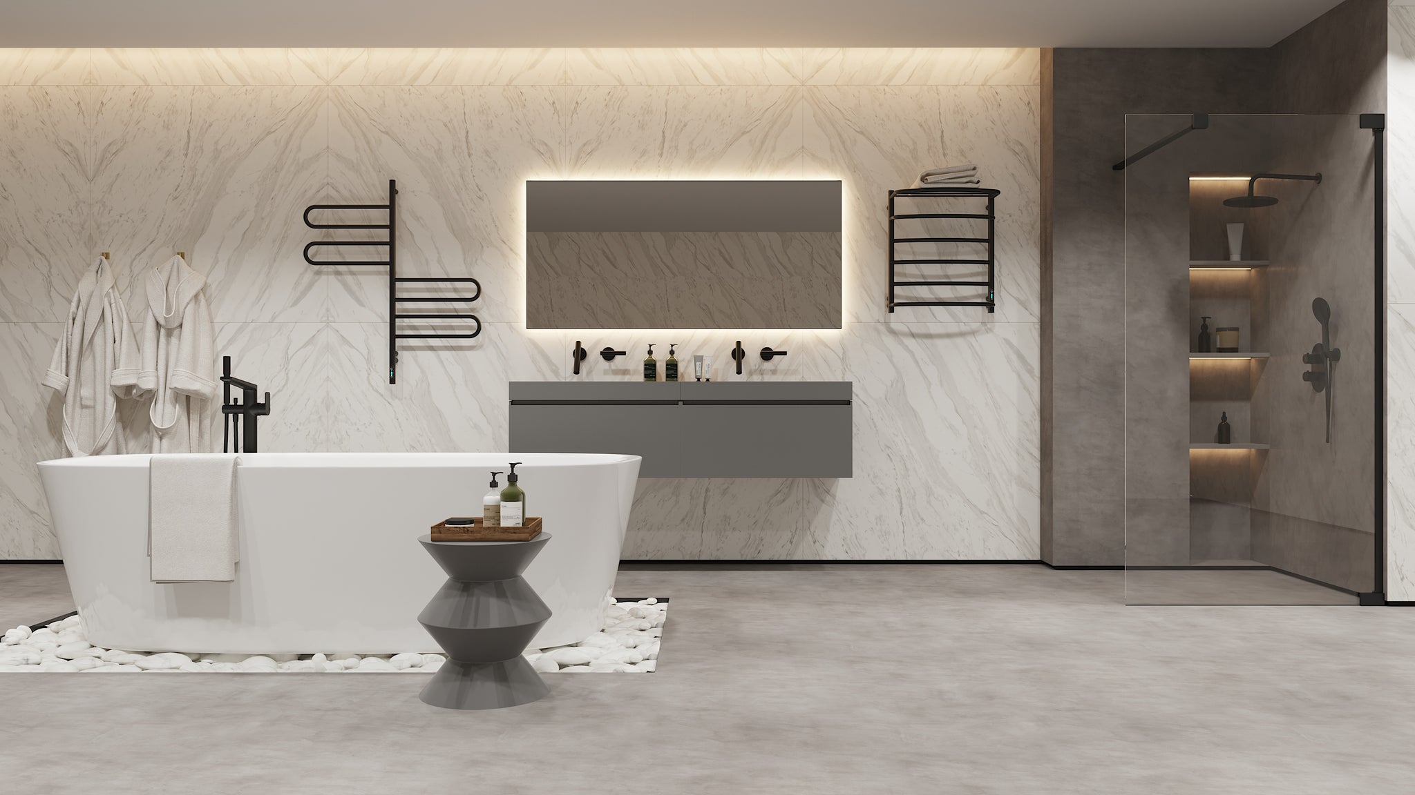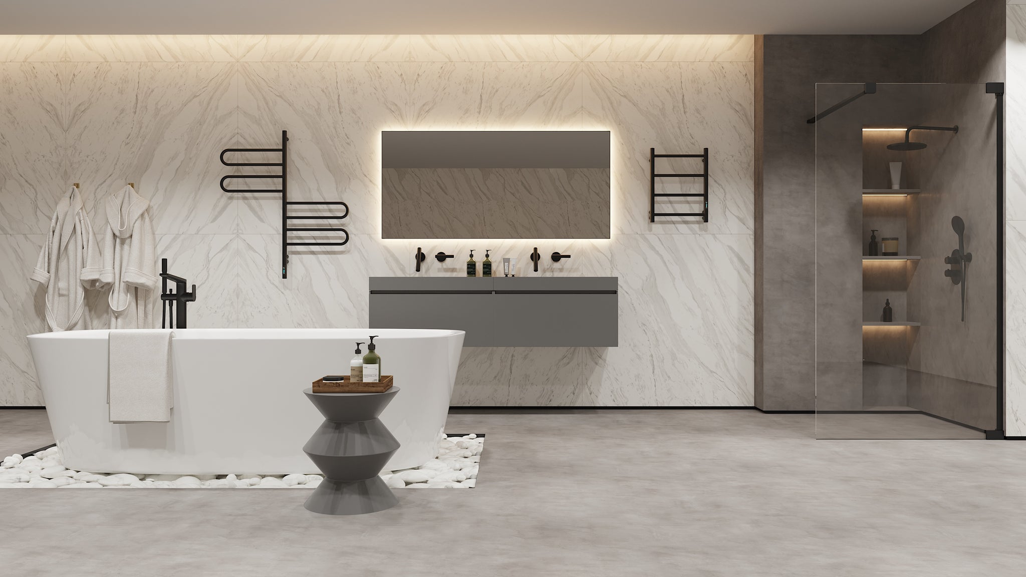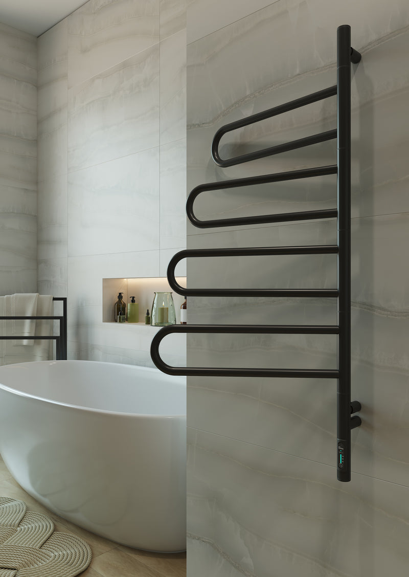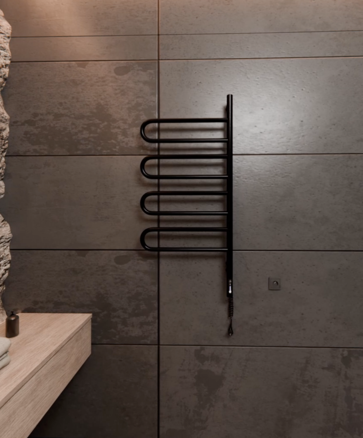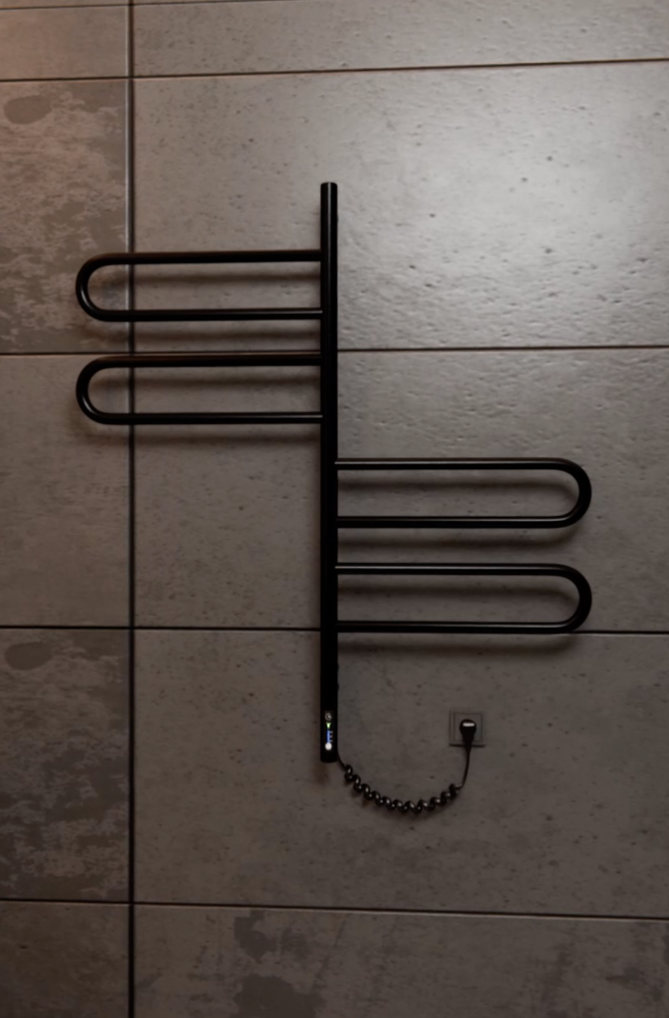 Este radiador toallero eléctrico para baño con acabado en negro mate cuenta con cuatro barras giratorias, cada una de las cuales puede girar 180° independientemente de las otras. Decisión de diseño perfecta para clientes que están totalmente enamorados de los colores industriales y las formas concisas del metal.