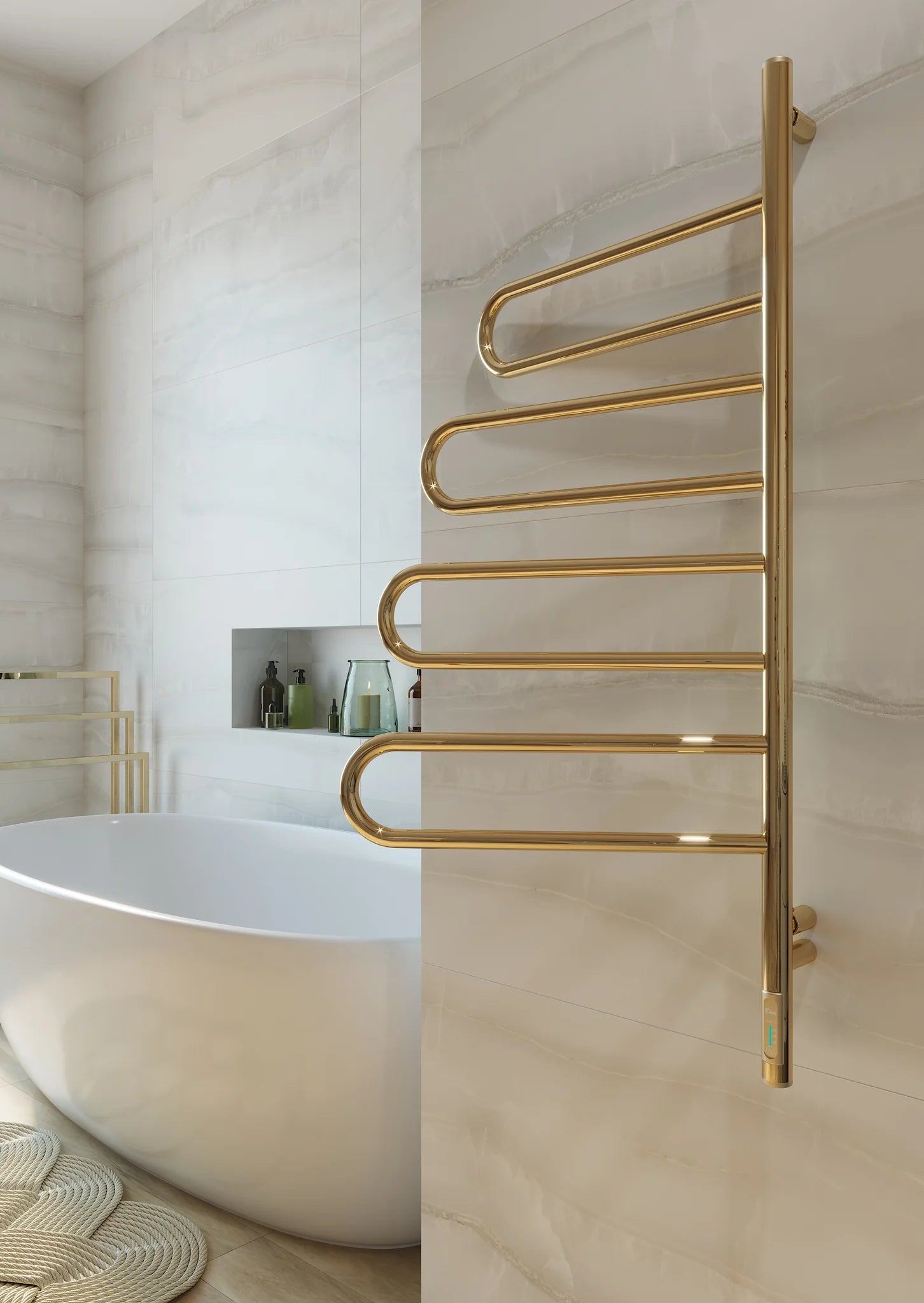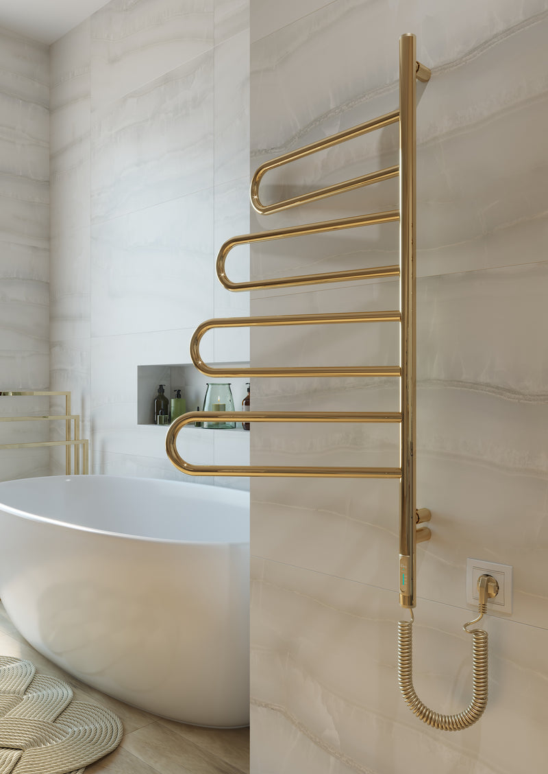 Este toallero eléctrico de baño con acabado en oro pulido presenta cuatro barras giratorias, cada una de las cuales puede rotar 180° independientemente de las otras. Este dispositivo eléctrico está fabricado en acero inoxidable y mediante el método de vacío PVD. Las cualidades funcionales y estéticas de un recubrimiento de nitruro de titanio son duraderas durante varias décadas. La superficie perfectamente espejada del dispositivo y su agradable tono dorado aterciopelado enfatizarán la lujosa atmósfera del baño.