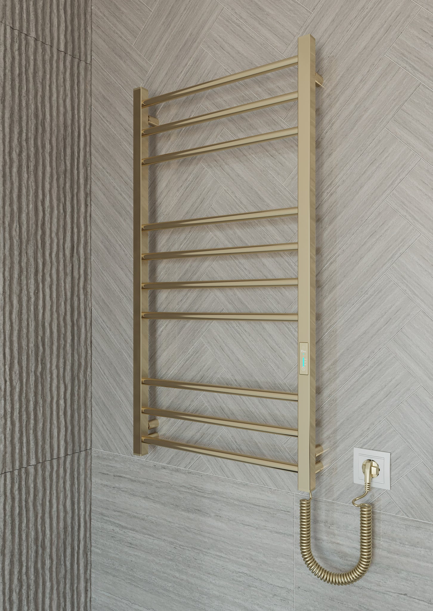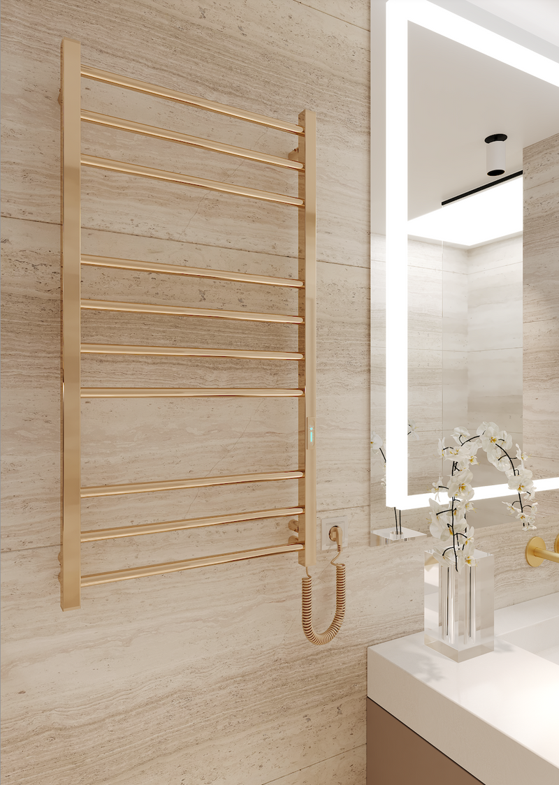 Siguiendo las tendencias mundiales en diseño de interiores de baños, le presentamos el toallero eléctrico con acabado en oro pulido con efecto espejo. Decisión de diseño perfecta para clientes que están totalmente enamorados de los tonos cálidos del oro y las formas concisas del metal. El toallero está hecho de acero inoxidable y mediante el uso del método de vacío PVD. Las cualidades funcionales y estéticas de un recubrimiento de nitruro de titanio del toallero son duraderas durante varias décadas.