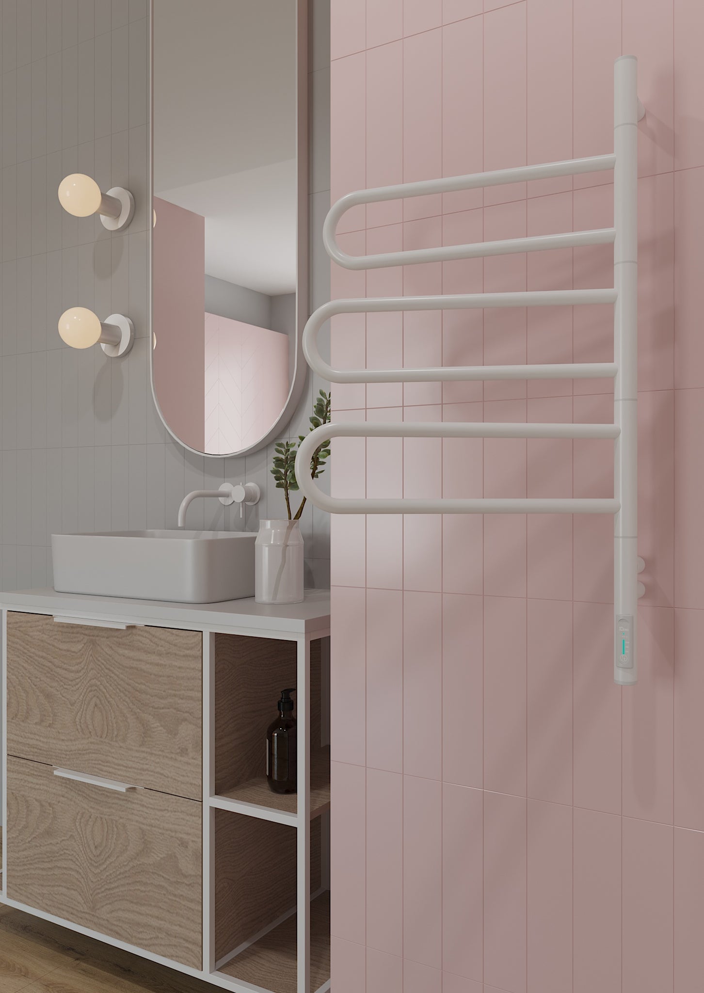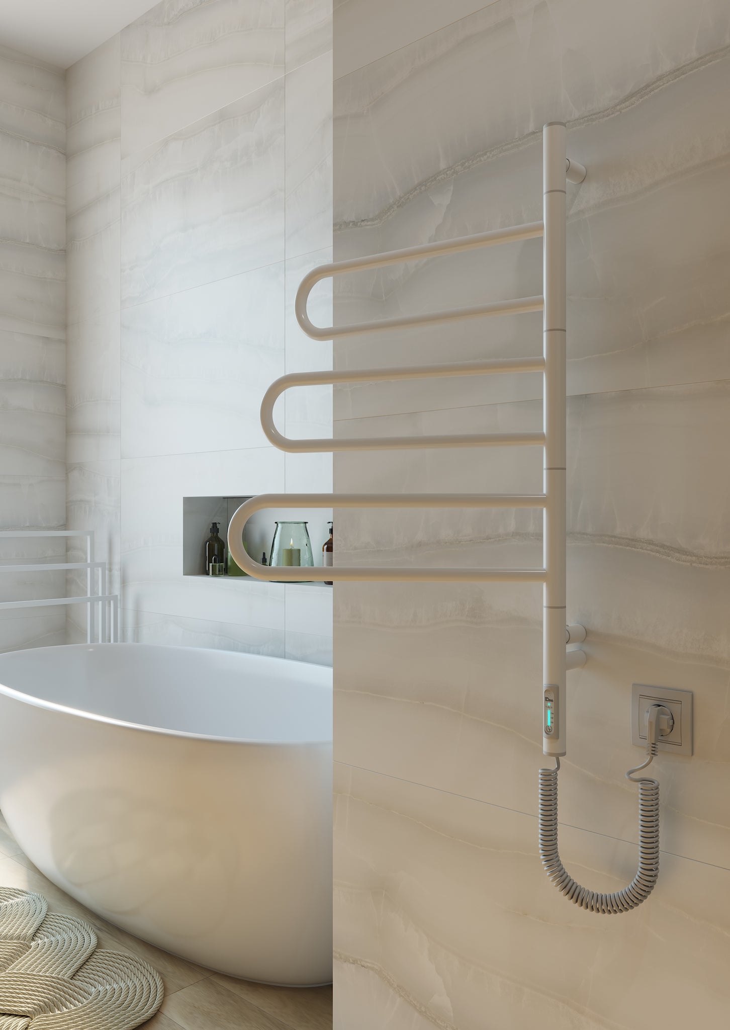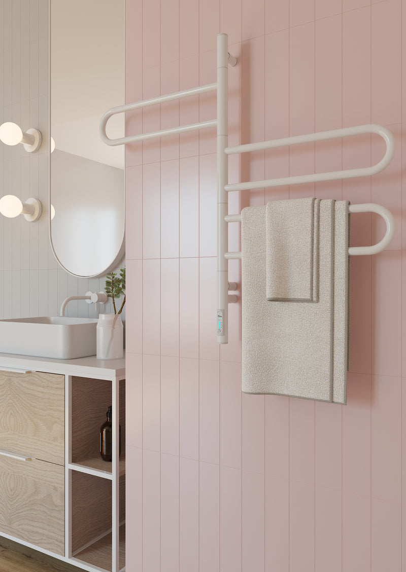 Este radiador toallero eléctrico para baño con acabado en blanco cuenta con tres barras giratorias, cada una de las cuales puede girar 180° independientemente de las otras. Decisión de diseño perfecta para clientes que están totalmente enamorados de los colores clásicos y las formas concisas del metal.