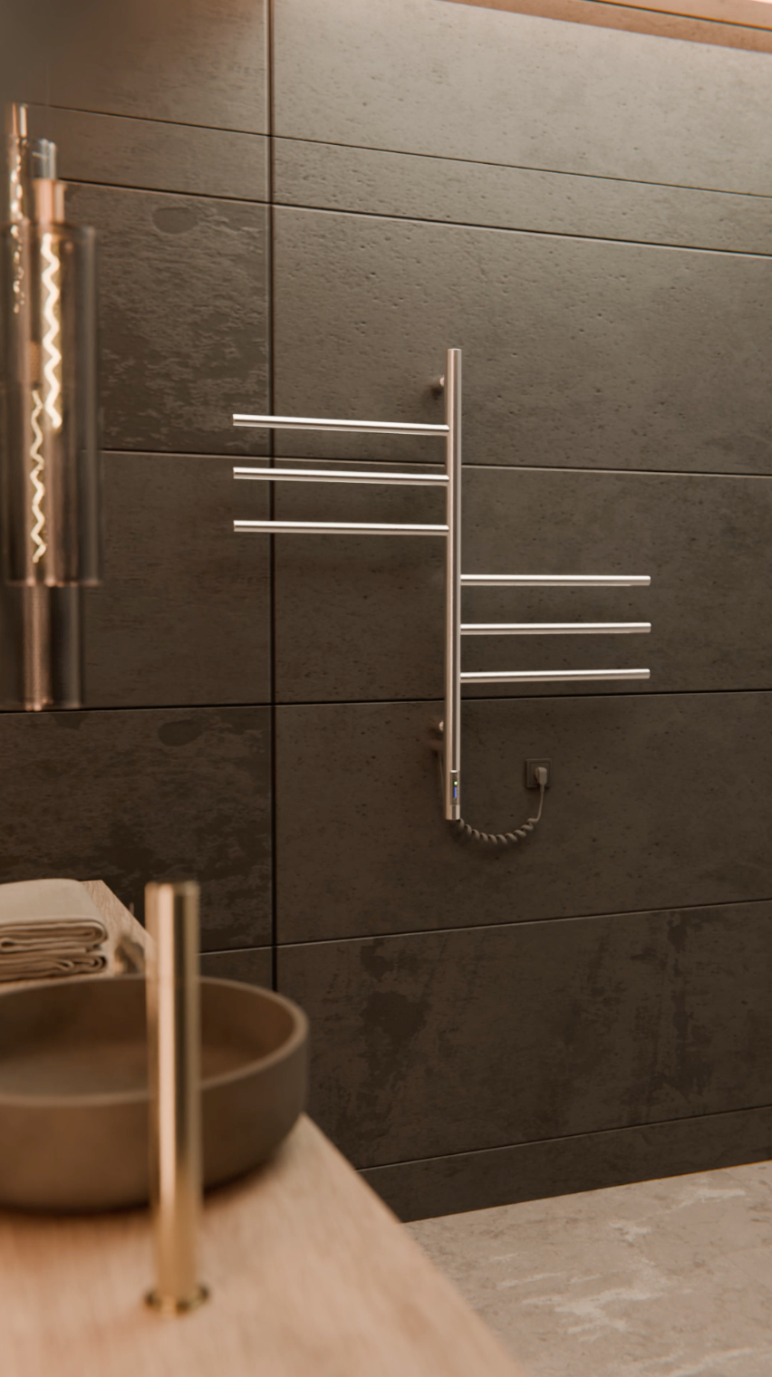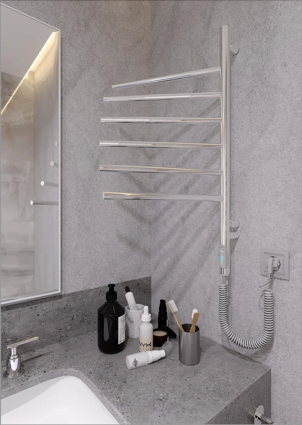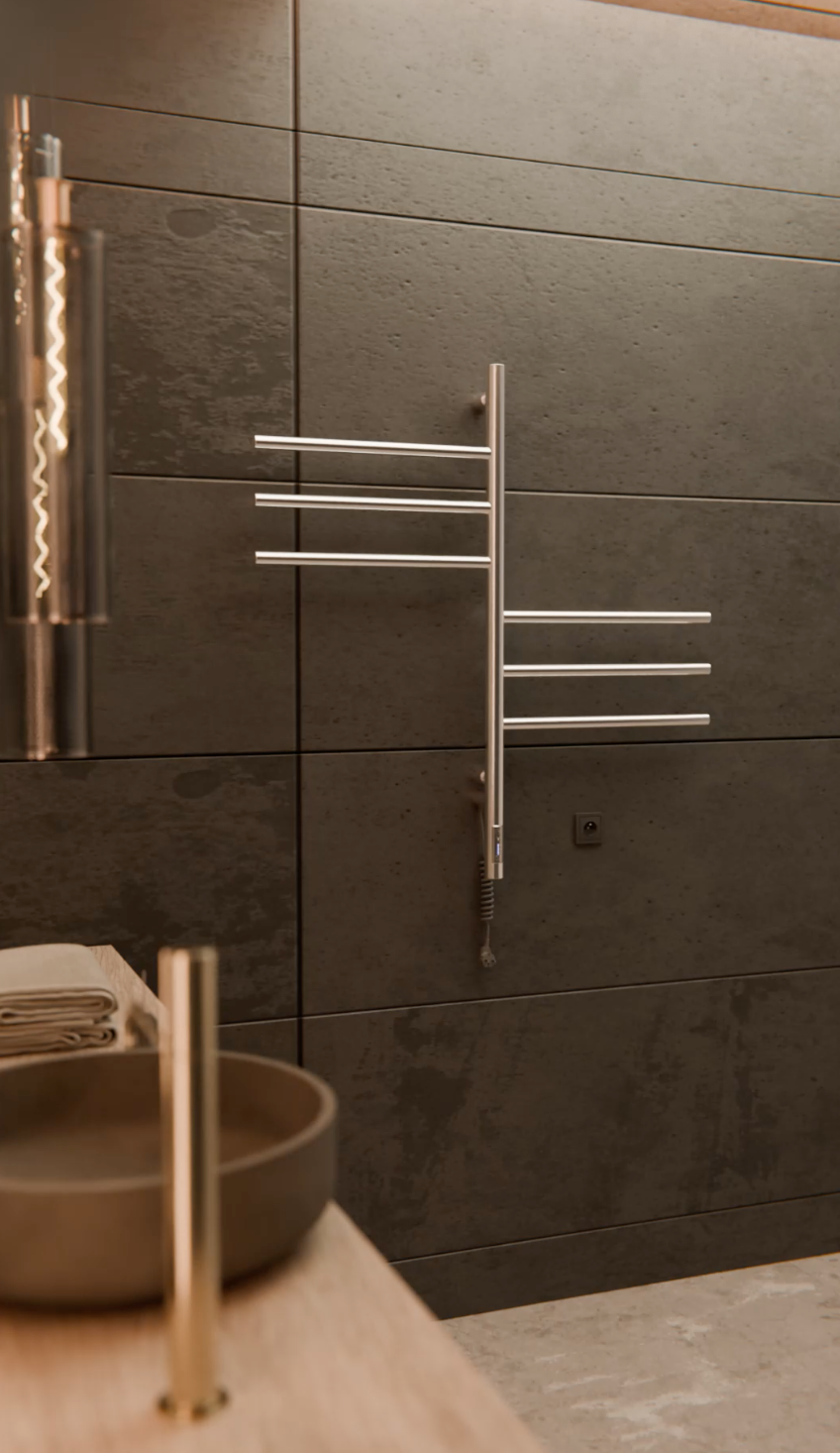 Este radiador toallero eléctrico para baño con acabado en cromo cuenta con seis barras giratorias, cada una de las cuales puede girar 180° independientemente de las otras. Decisión de diseño perfecta para clientes que están totalmente enamorados de los tonos fríos del cromo y las formas concisas del metal.
