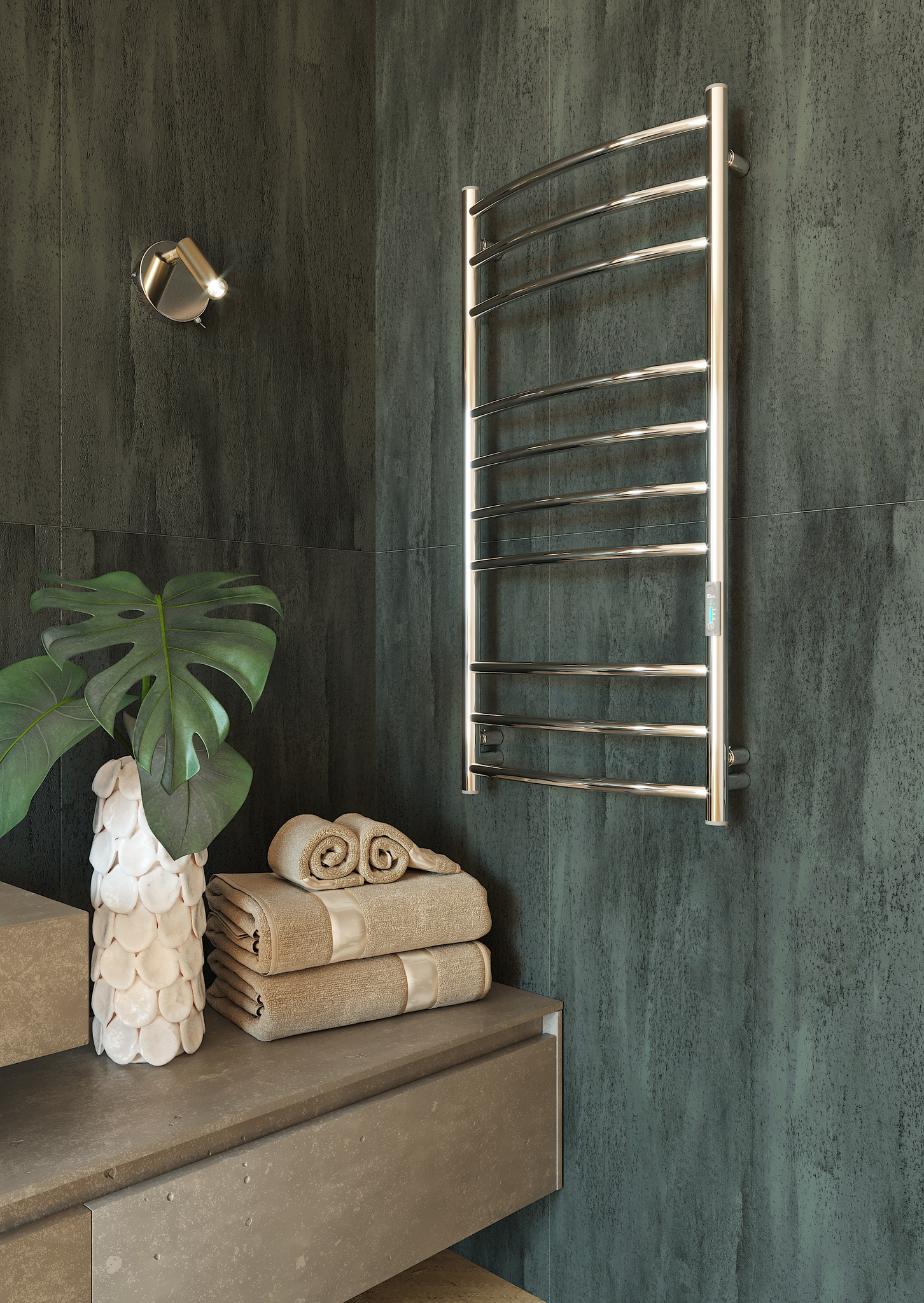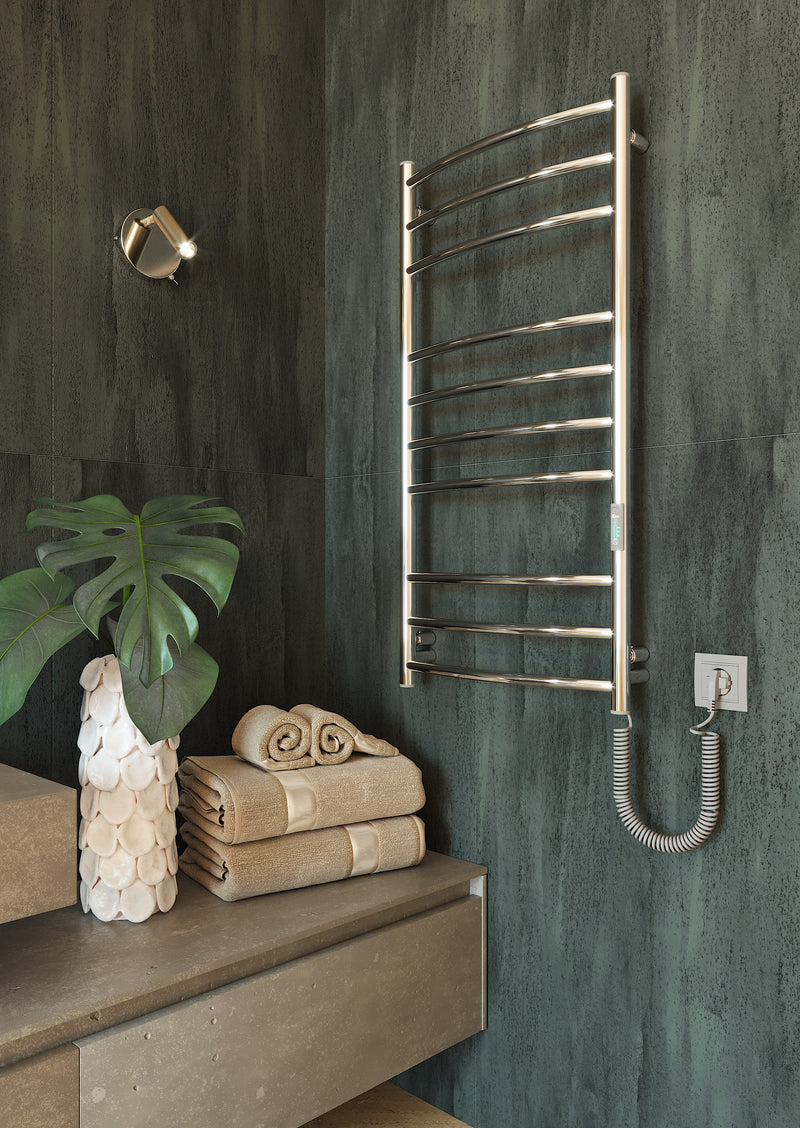 Siguiendo las tendencias mundiales en diseño de interiores de baños, le presentamos un radiador toallero eléctrico con acabado en acero pulido. Decisión de diseño perfecta para los clientes que están totalmente enamorados de los tonos fríos del cromo y las formas concisas del metal.