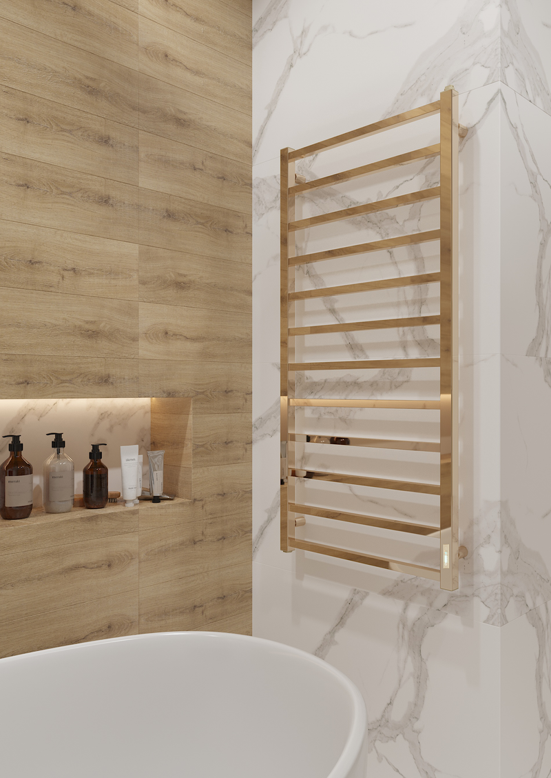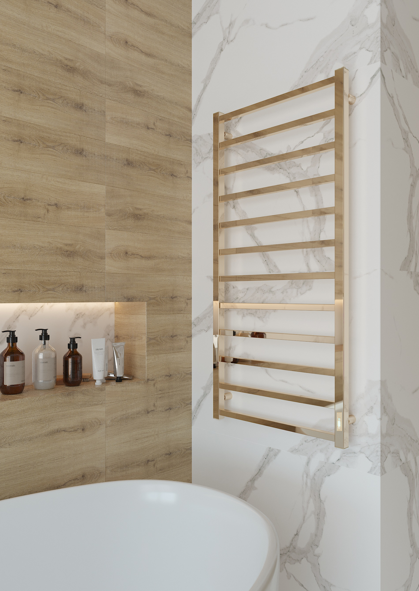 Siguiendo las tendencias mundiales en diseño de interiores de baños, le presentamos el toallero eléctrico con acabado en oro pulido con efecto espejo. Decisión de diseño perfecta para clientes que están totalmente enamorados de los tonos cálidos del oro y las formas concisas del metal. El toallero está hecho de acero inoxidable y mediante el uso del método de vacío PVD. Las cualidades funcionales y estéticas de un recubrimiento de nitruro de titanio del toallero son duraderas durante varias décadas.