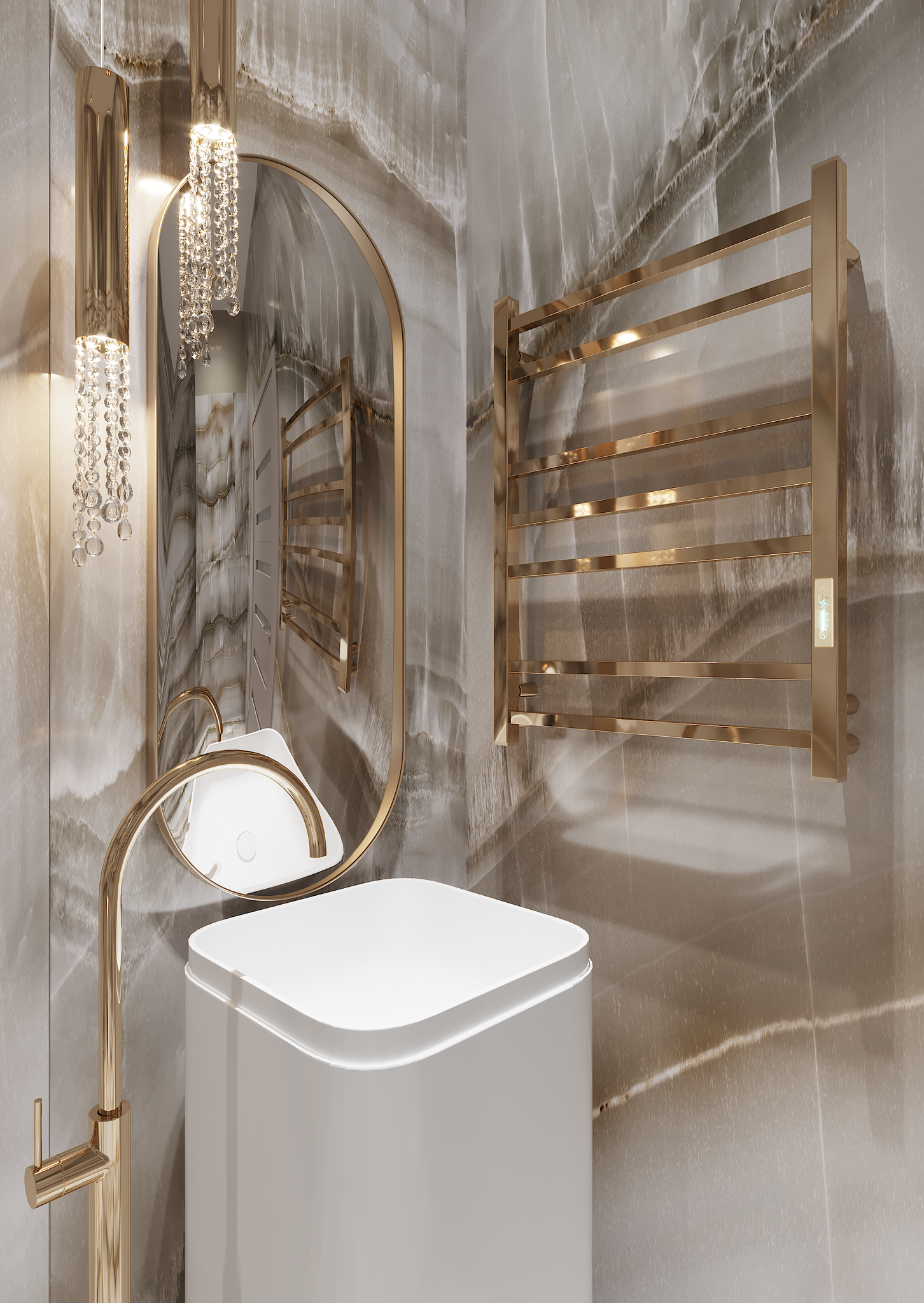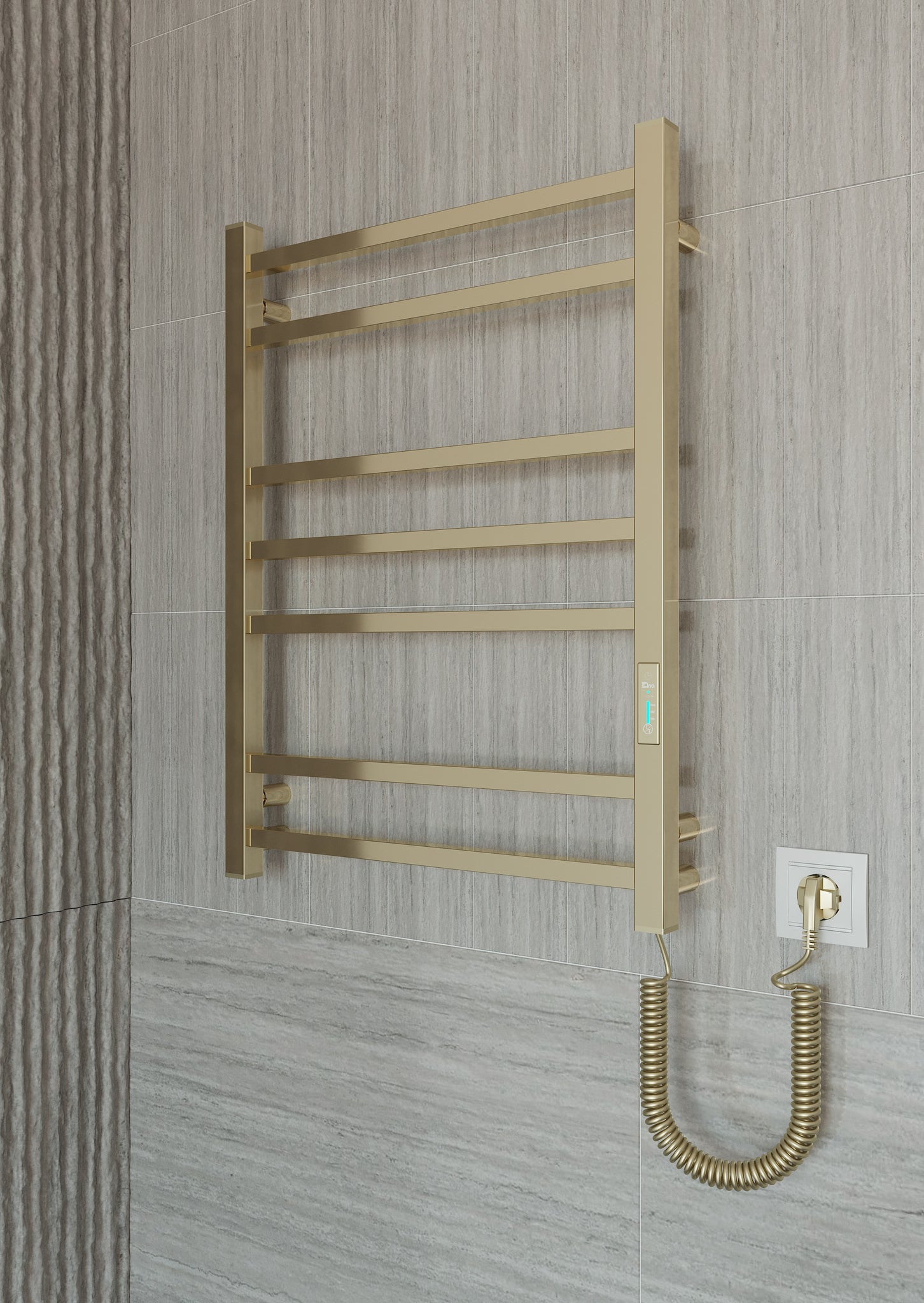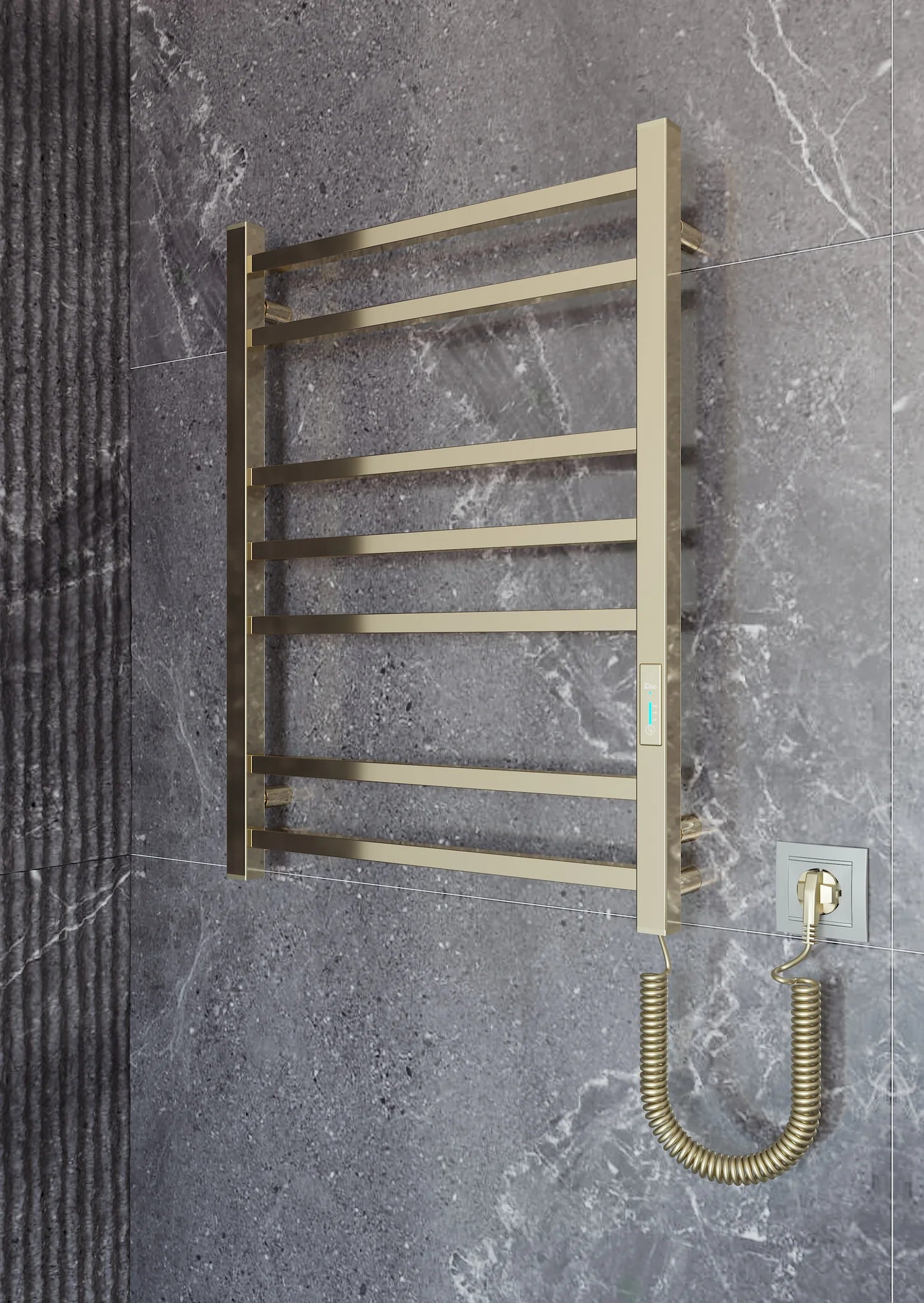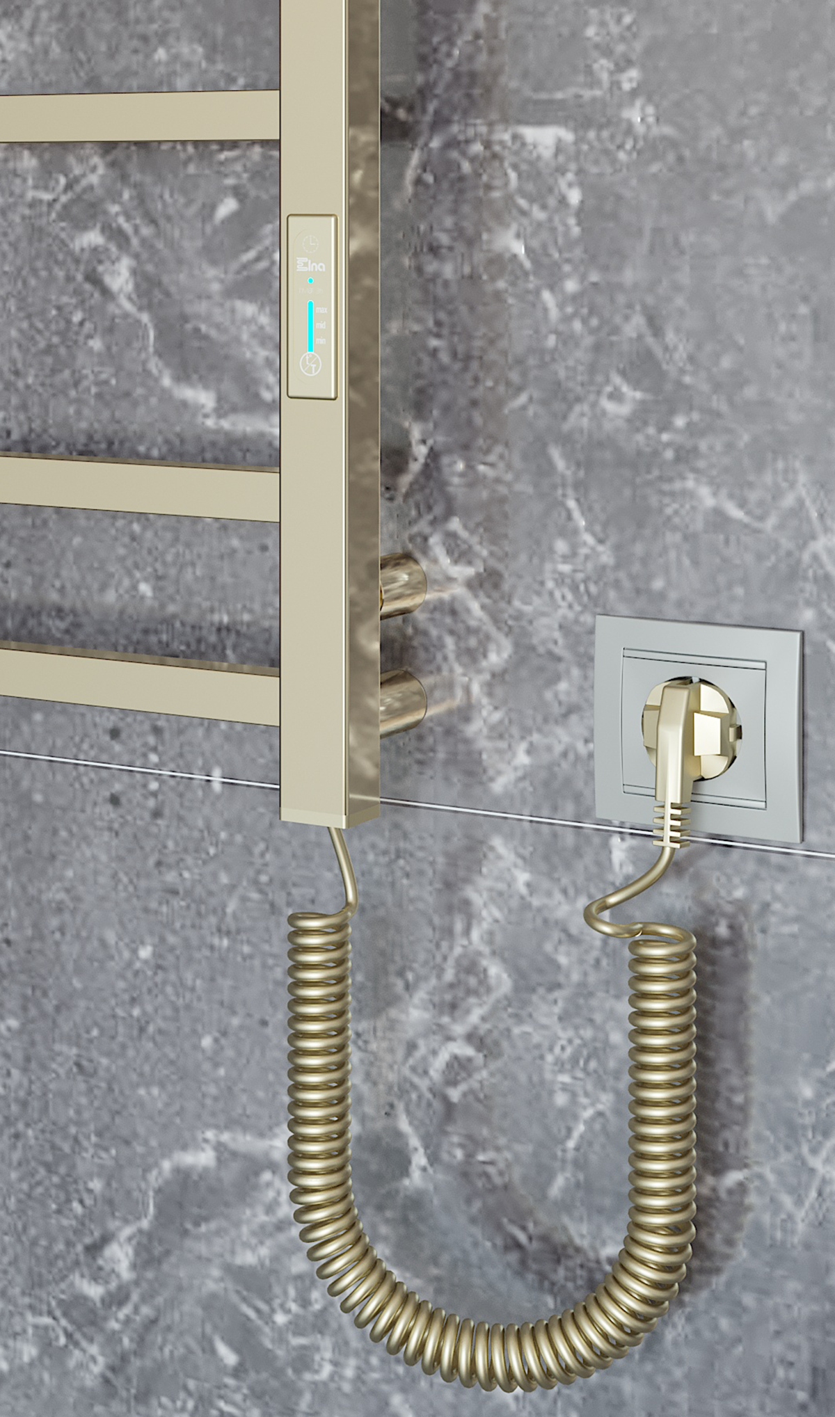 Siguiendo las tendencias mundiales en diseño de interiores de baños, le presentamos el toallero eléctrico con acabado en oro pulido con efecto espejo. Decisión de diseño perfecta para clientes que están totalmente enamorados de los tonos cálidos del oro y las formas concisas del metal. El toallero está hecho de acero inoxidable y mediante el uso del método de vacío PVD. Las cualidades funcionales y estéticas de un recubrimiento de nitruro de titanio del toallero son duraderas durante varias décadas.