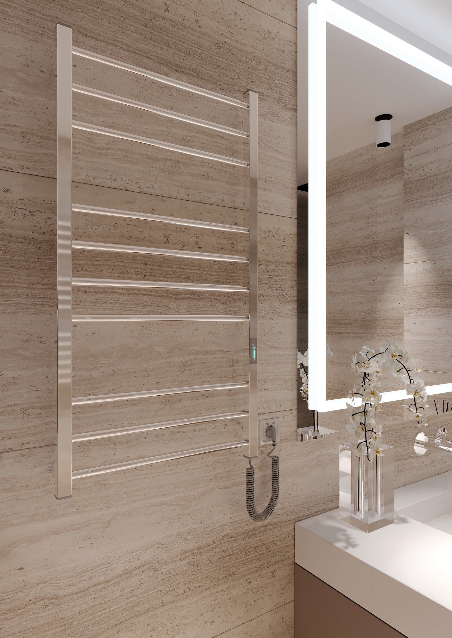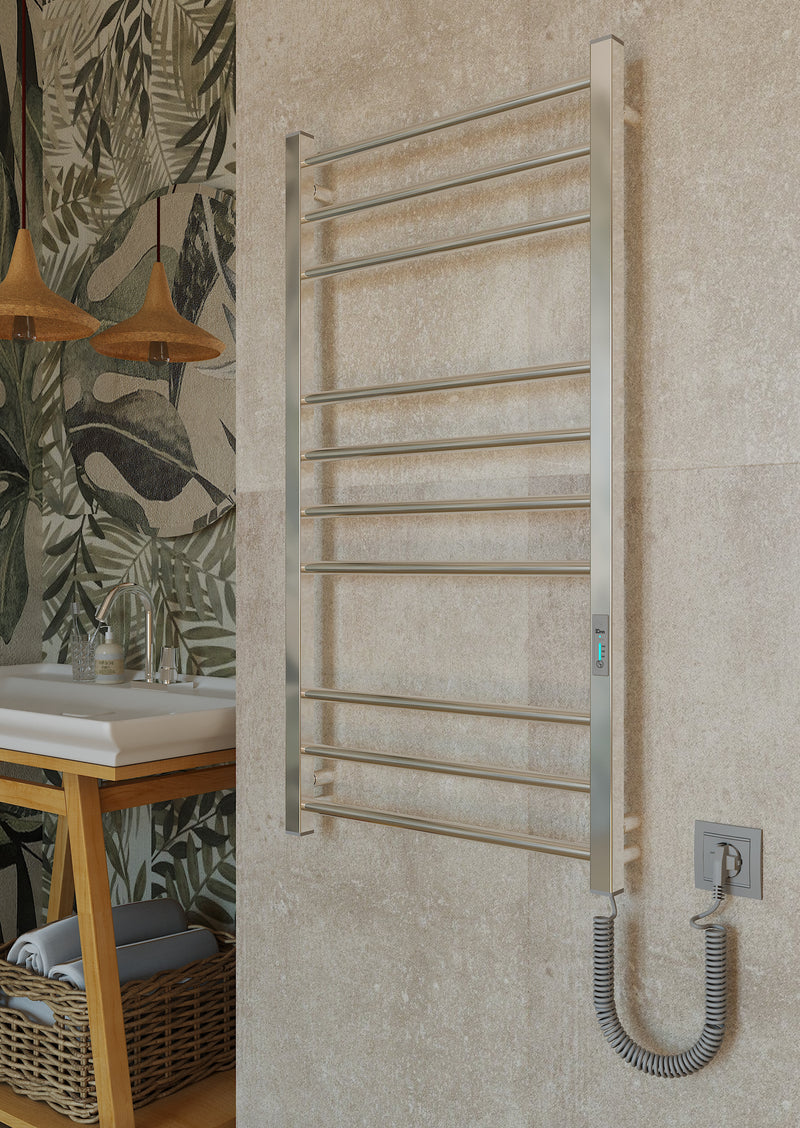 Following the world-wide trends in bathroom interior design, we present You an electric towel rail in polished steel finishing. Perfect design decision for the customers who are totally in love with the cold shades of chrome and concise shapes of metal.