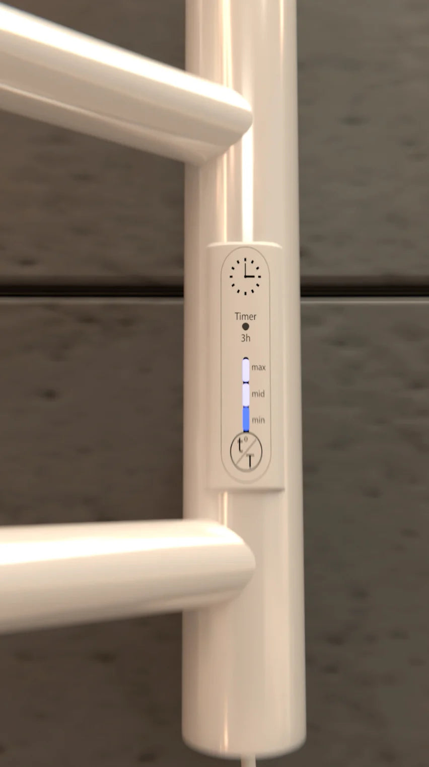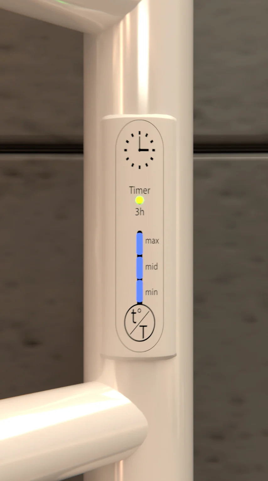 El toallero eléctrico incluye un regulador de temperatura con tres modos de calor ajustables y una función de temporizador incorporada. En el modo TEMPORIZADOR 3H, la unidad se apaga automáticamente después de tres horas de funcionamiento para mayor seguridad y ahorro de energía. Altamente eficiente energéticamente, este dispositivo eléctrico para el baño consume electricidad mínima y puede reducir el uso mensual de energía hasta en un 70%.